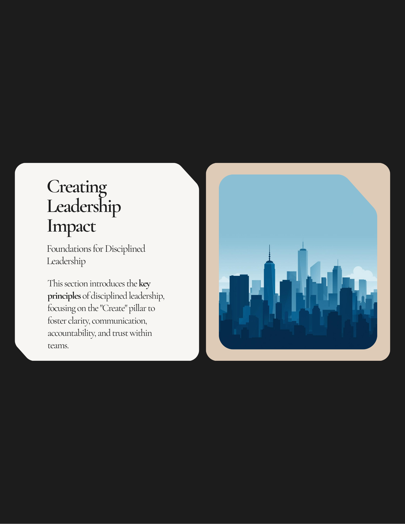 6-Week Transformation Roadmap-A guided plan that walks you through six focused weeks of leadership growth. Each week targets a core principle—Clarity, Communication, Accountability, Trust, Integration, and Reflection—to help you apply The Disciplined Leader framework and track measurable progress.